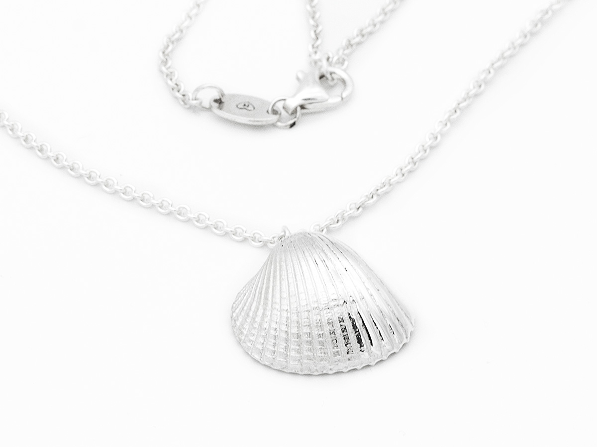 Ankerkette mit großem Muschelanhänger aus 925er Sterlingsilber. Ein Verlauf in der Oberflächenstruktur der Herzmuschel von matt zu glänzend, von natürlich zu poliert, macht diesen Anhänger zu etwas ganz Besonderem.